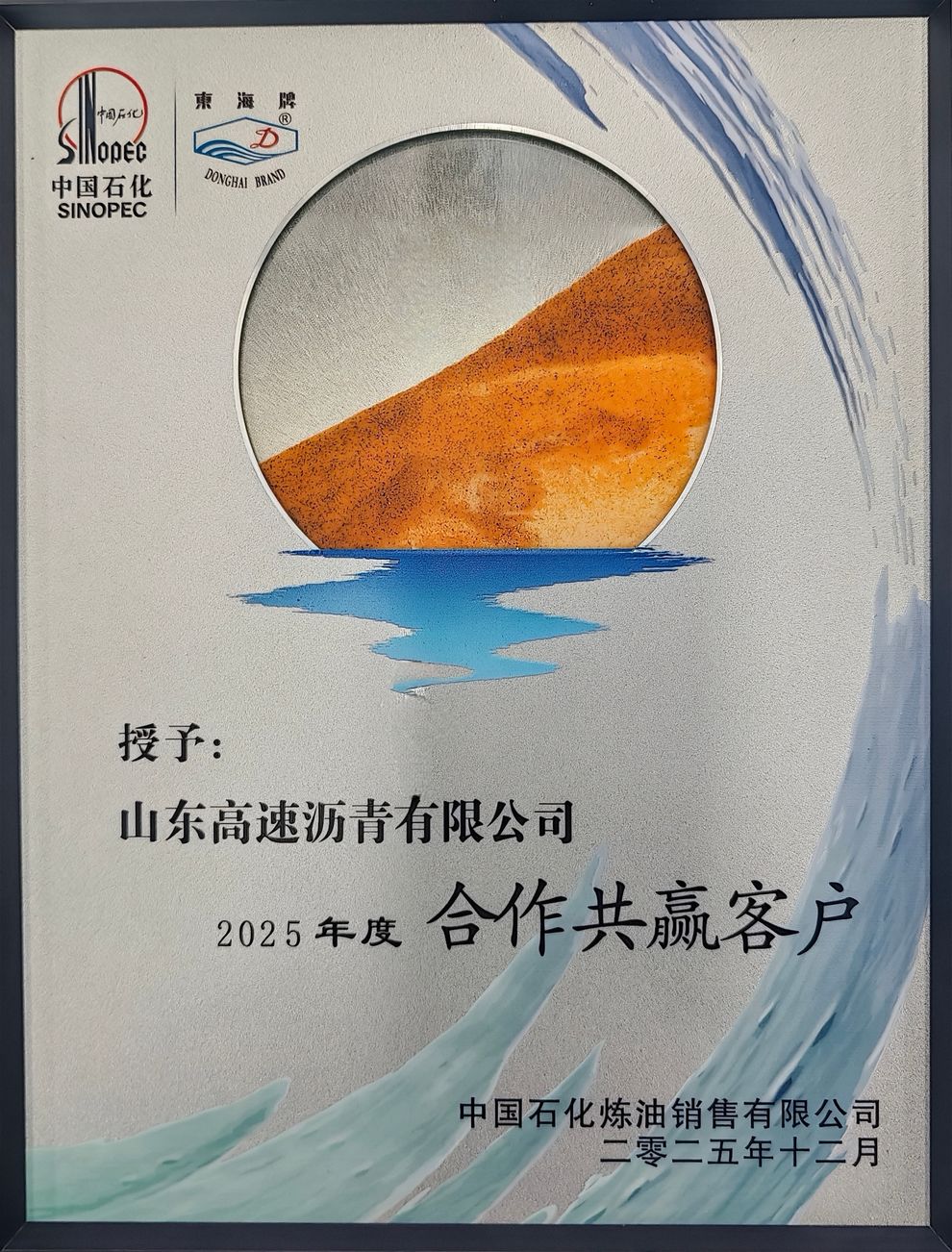12月18日,沥青公司受邀参加中国石化炼油销售有限公司(以下简称“中石化炼销公司”)在上海举办的“东海牌”沥青客户座谈会,被授予“市场领航客户”与“合作共赢客户”荣誉。